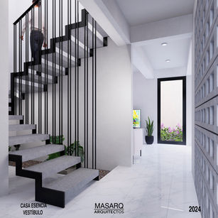 La implementación de un sistema de patios ubicados al frente y al fondo asegura una ventilación cruzada eficiente maximizando el confort térmico al interior de la casa. La morfología del diseño se caracteriza por la superposición de macizos y vanos creando una composición que juega con alturas ortogonales. Este diseño genera una interacción dinámica entre luz y sombra enriqueciendo la experiencia espacial.
